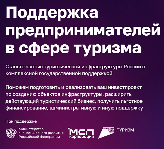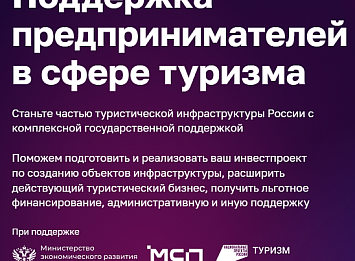 - воспользоваться региональными и федеральными инструментами поддержки инвестиционных проектов в сфере туризма с возможностью комплексного сопровождения через Цифровую платформу МСП.РФ, в том числе подобрать площадку для реализации инвестпроекта и ознакомиться с перечнем свободных объектов недвижимости и земельных участков всех уровней собственности;