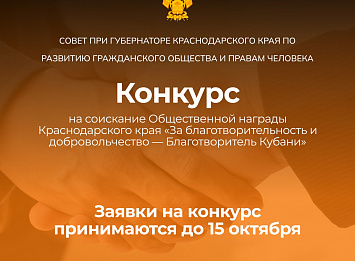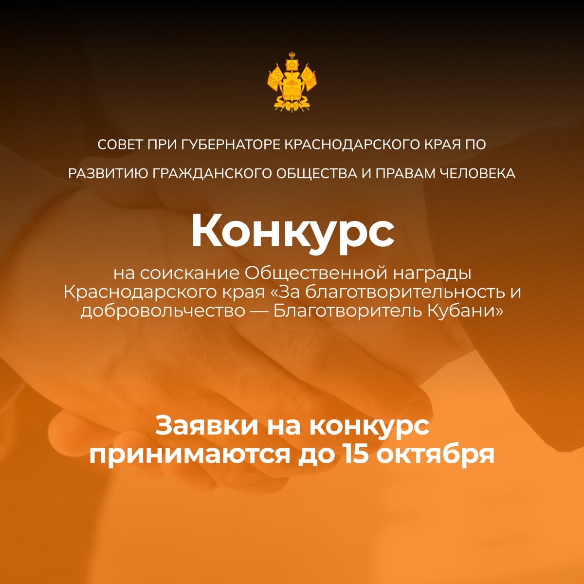 Постоянная рабочая группа Совета по благотворительности и добровольчеству объявляет о начале приема заявок на соискание общественной награды «За благотворительность и добровольчество — Благотворитель Кубани».